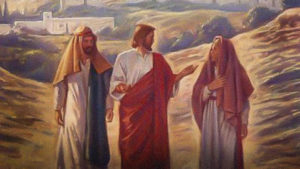 Elə o gün onlardan ikisi Yerusəlimdən altmış stadi uzaqlığında yerləşən Emmaus adlı kəndə gedirdi. Onlar olub-keçən bütün bu hadisələr barədə öz aralarında söhbət edirdi. Onlar söhbət edərək öz aralarında müzakirə edərkən İsa Özü yaxınlaşıb onlarla birlikdə yol getdi. Amma onların gözləri tutulmuşdu, buna görə Onu tanımadılar. Amma İsa onlardan soruşdu: “Siz yol gedə-gedə öz aranızda nə barədə danışırdınız? Nə üçün belə qəmlisiniz?”