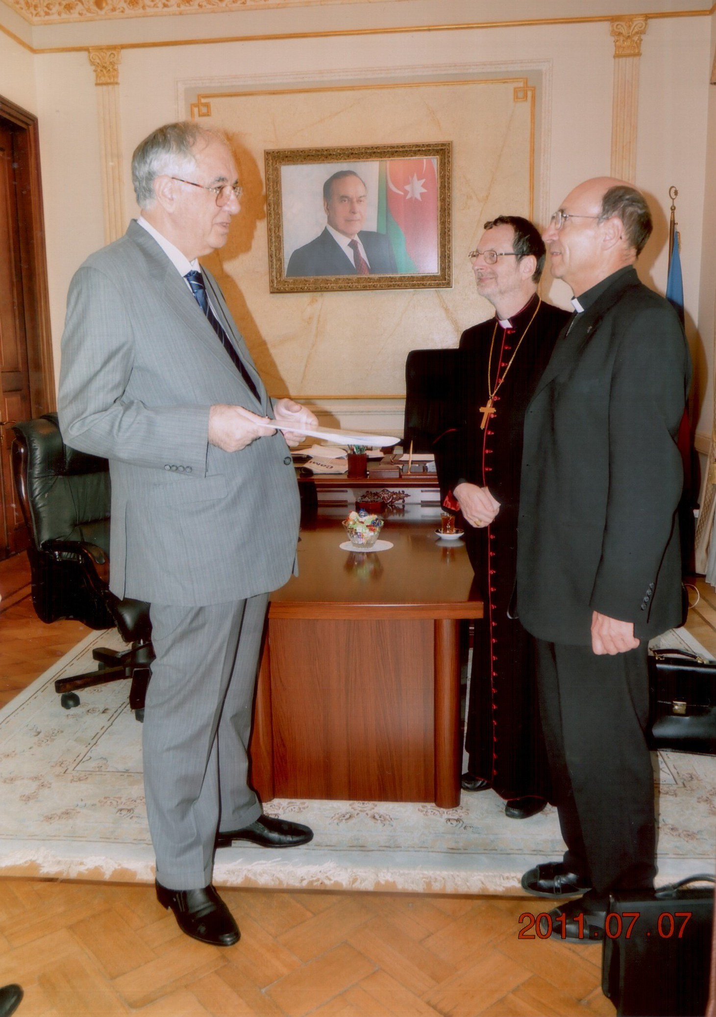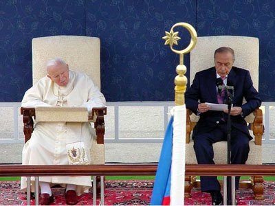 В 2002 году происходит историческое событие – первый визит римского понтифика, папы Иоанна Павла II в Азербайджан. В аэропорту Папу, вопреки протоколу, встречает глава государства Гейдар Алиев, что явилось жестом особого уважения к личности понтифика и подчеркивало значение, которое имел этот визит для Азербайджана. В своем приветственном слове Гейдар Алиев, обращаясь к папе Иоанну Павлу II, в числе прочего, сказал: