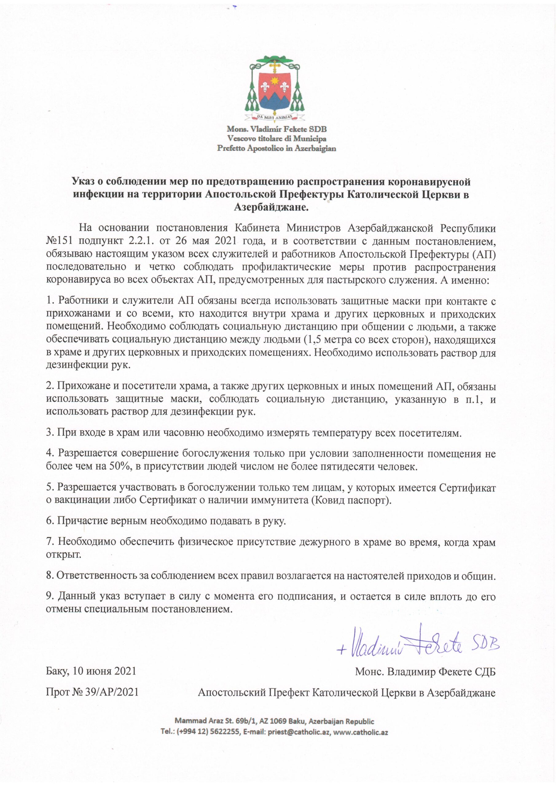 На основании постановления Кабинета Министров Азербайджанской Республики №151 подпункт 2.2.1. от 26 мая 2021 года, и в соответствии с данным постановлением, обязываю настоящим указом всех служителей и работников Апостольской Префектуры (АП) последовательно и четко соблюдать профилактические меры против распространения коронавируса во всех объектах АП, предусмотренных для пастырского служения. А именно: